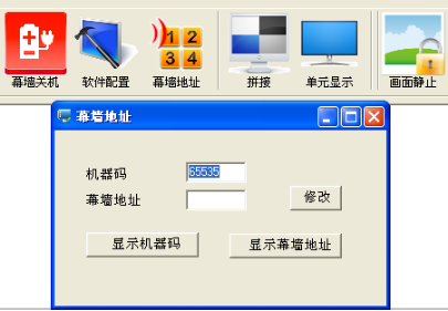 例如以2X2拼接幕為列從左到右數(shù)如圖11中的機(jī)器碼15569顯示的是第四塊屏幕,那么就把15569填寫到機(jī)器碼框中.幕墻地址框中就改成4,點(diǎn)擊修改,然后關(guān)掉完成再進(jìn)行下一個(gè)修改.