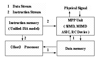 具體對(duì)指令流體系結(jié)構(gòu)來(lái)說(shuō),其SISD、SIMD、MISD、MIMD四類體系結(jié)構(gòu)的指令子集合是統(tǒng)一成SISD體系結(jié)構(gòu)的指令集合,對(duì)于數(shù)據(jù)流與構(gòu)令流的體系結(jié)構(gòu)是通過增加相應(yīng)的指令,統(tǒng)一成SISD體系結(jié)構(gòu)的指令集合的;換句話說(shuō),圖1中的SIMD、MIMD、ASIC與RC Device四種 MPP Unit都是可以通過軟構(gòu)件描述的。這些軟構(gòu)件是可以在SIMD或MIMD體系結(jié)構(gòu)上直接執(zhí)行的,或者是可以自動(dòng)映射成ASIC或RC Device電路的。(2)虛擬的并行計(jì)算陣列
