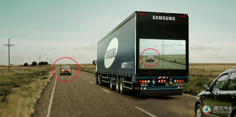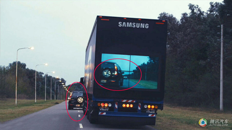 三星近期推出了一款"2X2拼接屏安全卡車",該卡車可以在后車試圖超車時給予安全提示,以減少車禍發生。該卡車尾部巨大的液晶屏實時顯示前方道路情況,當后車試圖借道超車時就可以從屏幕中看到對向是否有車正迎面駛來。
